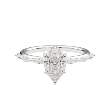 Haxey features a delicately tapered: Pear Hidden Halo Diamond Band Ring 2.50ct Pear D VVS2 2xExl None IGI Lab-Grown Diamond, paired with 0.25ct D VS side stones and an elegant hidden halo. (Customisable to your exact specifications—please enquire.) Available in 18K White, Yellow, or Rose Gold, and