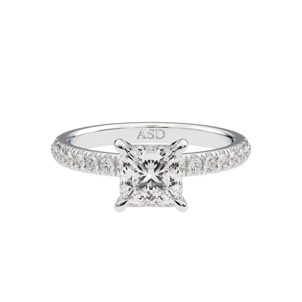 2.50ct Princess D VVS2 2XExl None IGI Lab-Grown Diamond, accented by 0.25ct D VS side stones in a graceful hidden halo design. (Customisable to your exact specifications—please enquire.)